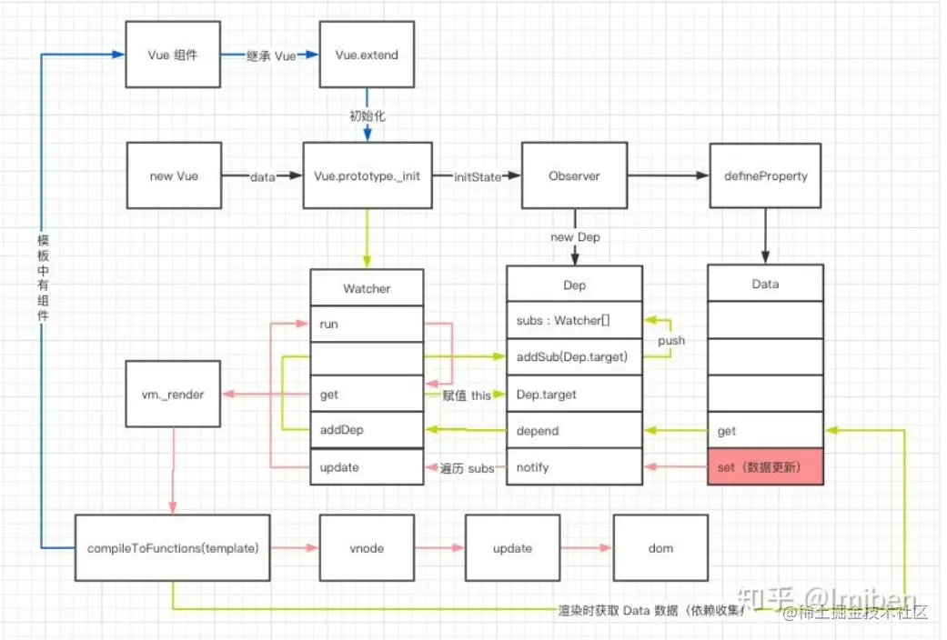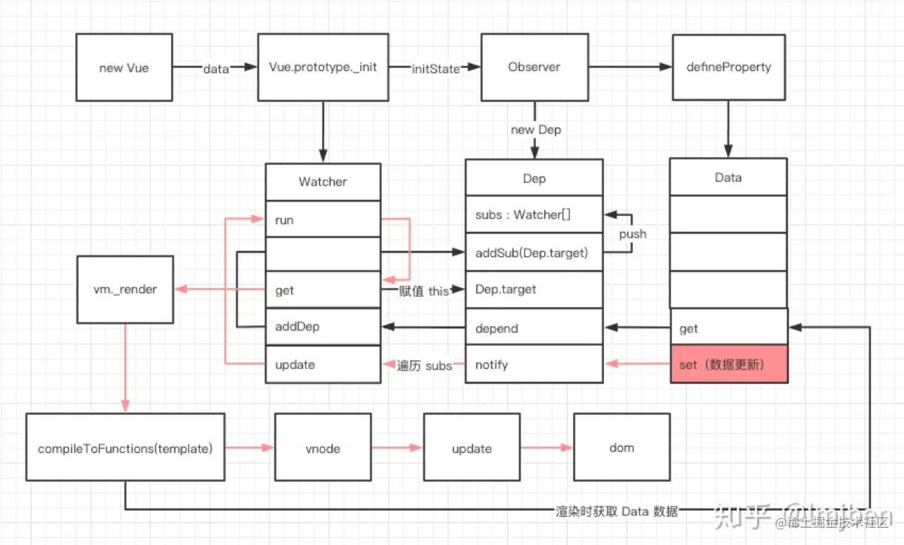 到这里我们分析了 Vue 初始化过程中的数据是如何进行绑定的: Vue 通过 defineProperty 完成了 Data 中所有数据的代理, 当数据触发 get 查询时,会将当前的 Watcher 对象加入到依赖收集池 Dep 中, 当数据 Data 变化时,会触发 set 通知所有使用到这个 Data 的 Watcher 对象去 update 视图。