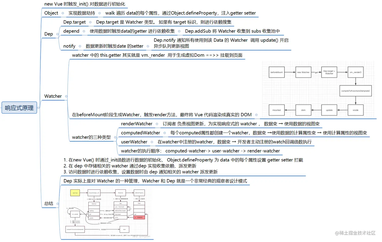 - 派发更新:在 setter 中通知 Dep,通知所有依赖于该属性的 Watcher 进行更新。