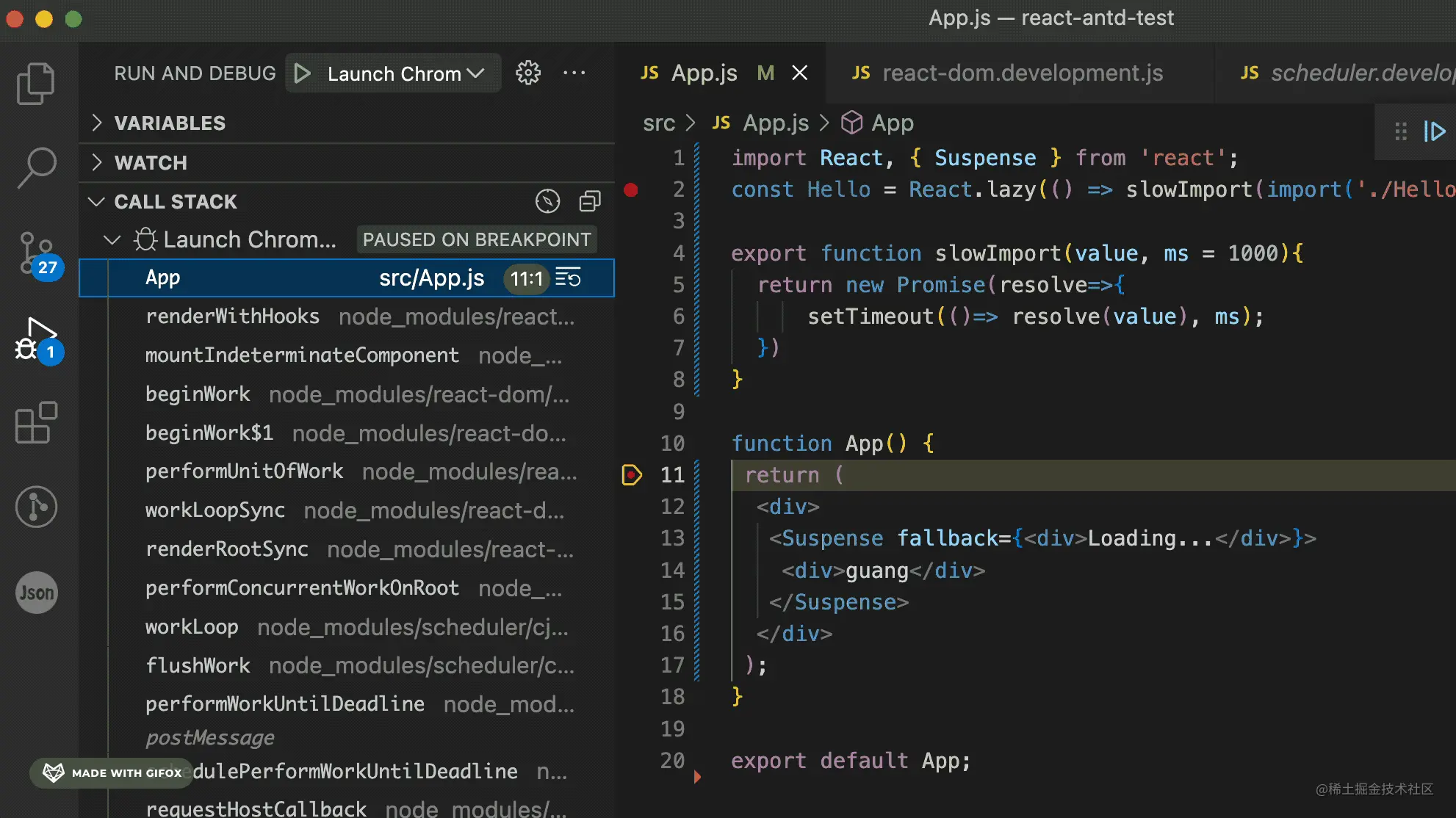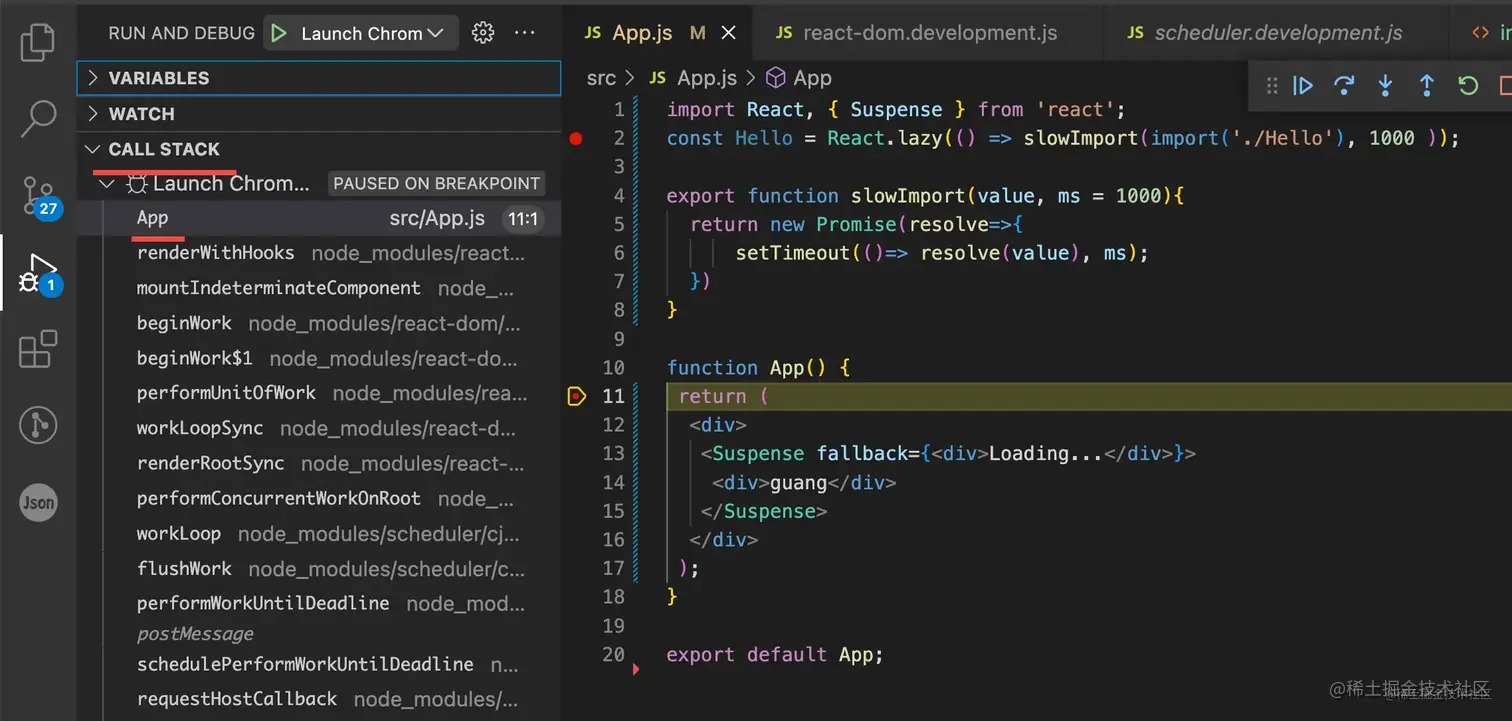 你可以点开调用栈的每一帧看下都执行了啥逻辑,用到啥数据。比如可以看到这个函数组件的 fiber 节点: