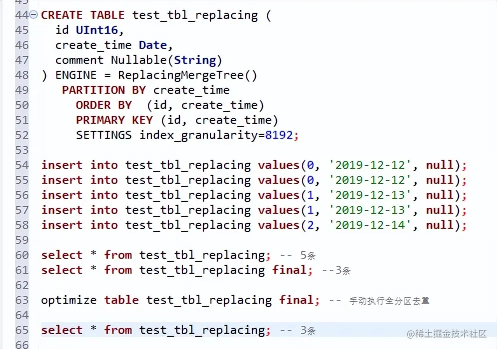 - 物化列与别名列的区别: 物化列是会保存数据,查询的时候不需要计算,而别名列不会保存数据,查询的时候需要计算,查询时候返回表达式的计算结果