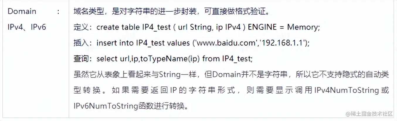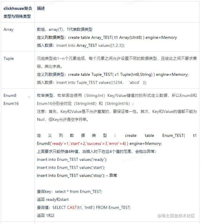- ALIAS :别名列。这样的列不会存储在表中。 它的值不能够通过INSERT写入,同时SELECT查询使用星号时,这些列也不会被用来替换星号。 但是它们可以用于SELECT中,在这种情况下,在查询分析中别名将被替换。