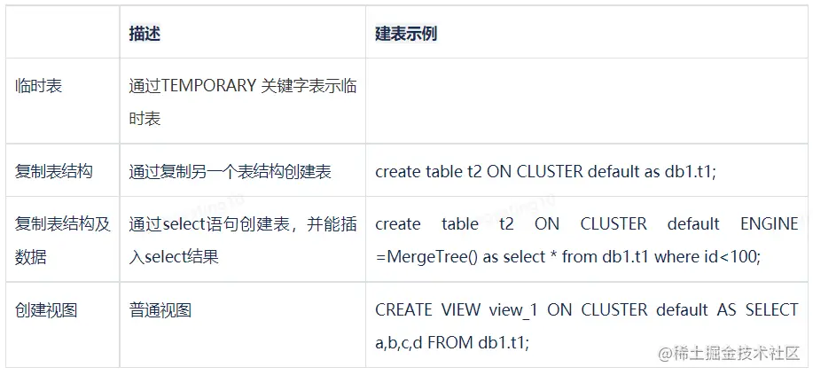 - cluster:指定集群名称,目前固定为default。ON CLUSTER 将在每一个节点上都创建一个本地表。