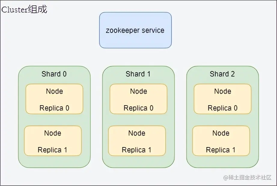 - ZooKeeper Service: 集群所有节点对等,节点间通过 ZooKeeper 服务进行分布式协调。