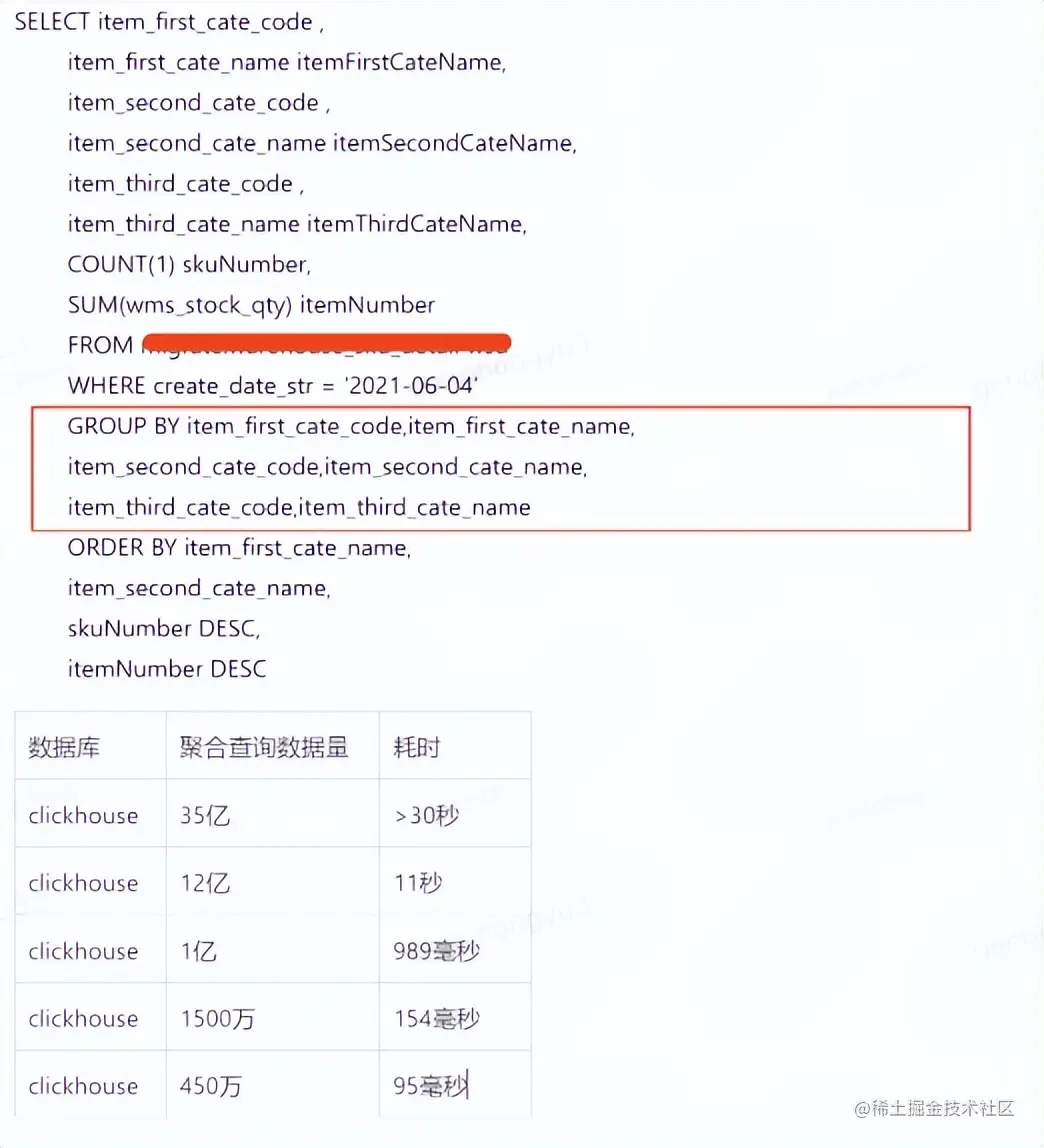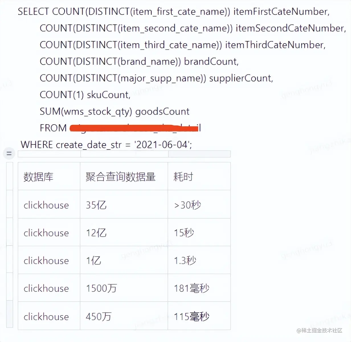 聚合查询性能举例:下图是搬仓系统一个聚合查询,在clickhouse中不同数据量级情况下的表现。这个查询在mysql中执行,一百万左右的数据量时,耗时已经是分钟级别。