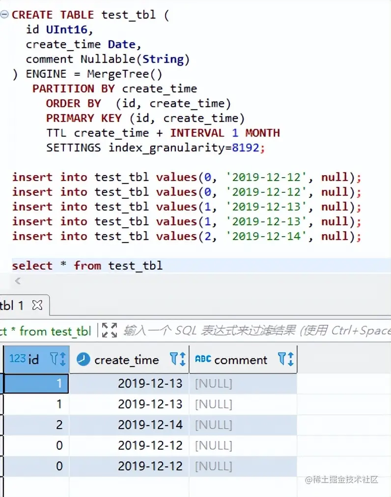 - PARTITION BY:指定分区键。通常按照日期分区,也可以用其他字段或字段表达式。(定义分区键一定要考虑清楚,它影响数据分布及查询性能)