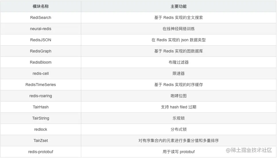 Redis 中的布隆过滤器 Redis v4.0 之后有了 Module(模块/插件)功能,Redis Modules 让 Redis 可以使用外部模块扩展其功能 ,使用户可以根据需要额外集成一些实用功能。