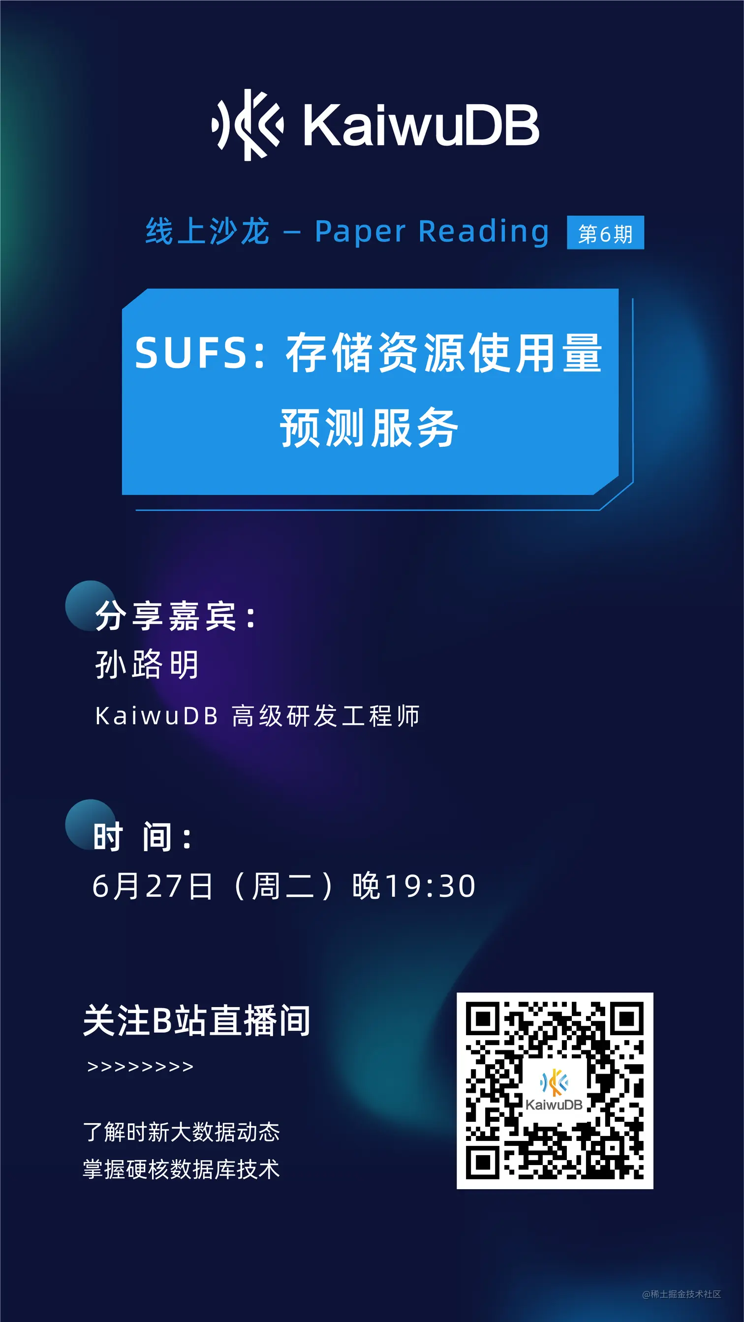 针对上述问题,本期直播我们邀请了 KaiwuDB 高级研发工程师孙路明博士为大家介绍 《SUFS: 存储资源使用量预测服务》 。孙博士毕业于中国人民大学,致力于研究人工智能技术驱动的数据库管理系统(AI4DB),在 SIGMOD、ICDE、TKDE 等数据库领域顶级国际会议和期刊发表多篇论文。