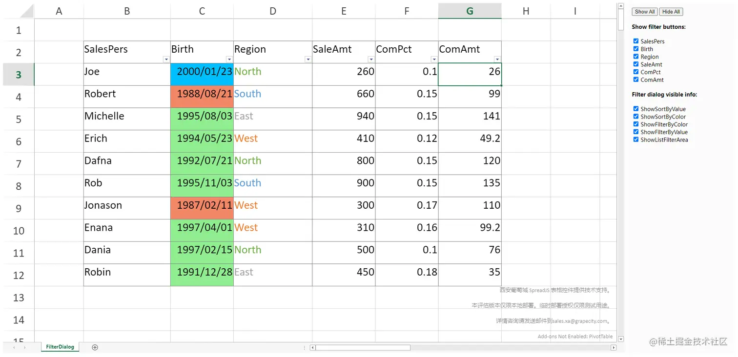 上图是表格数据筛选Demo的运行页面,页面中一共有五列数据,分别是销售员姓名、出生日期、销售区域、该销售员的销售总金额、销售月金额和销售比例,每列下包含10行数据信息。