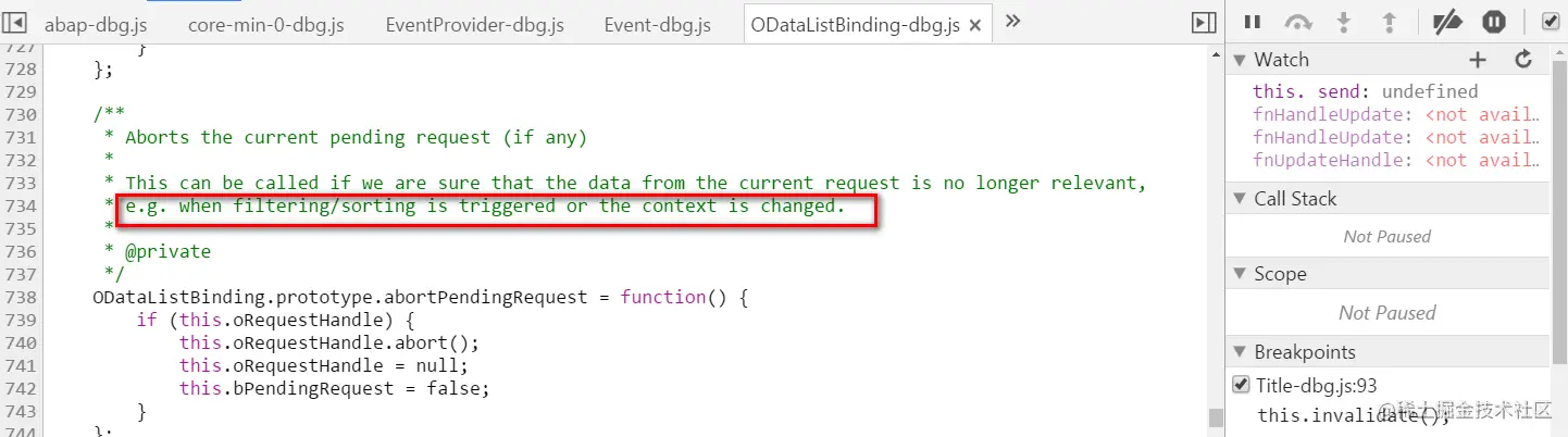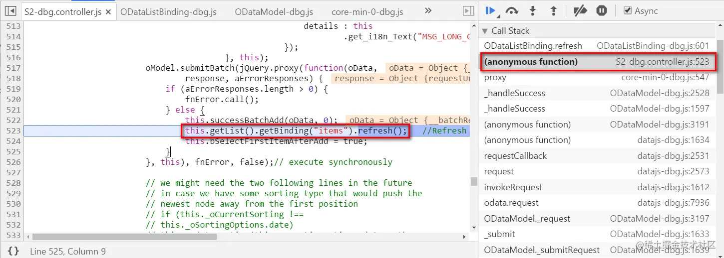 首先使用Chrome开发者工具network标签页里的Initiator功能,找到这些被cancel的OData请求,是下图第523行的refresh方法触发的: