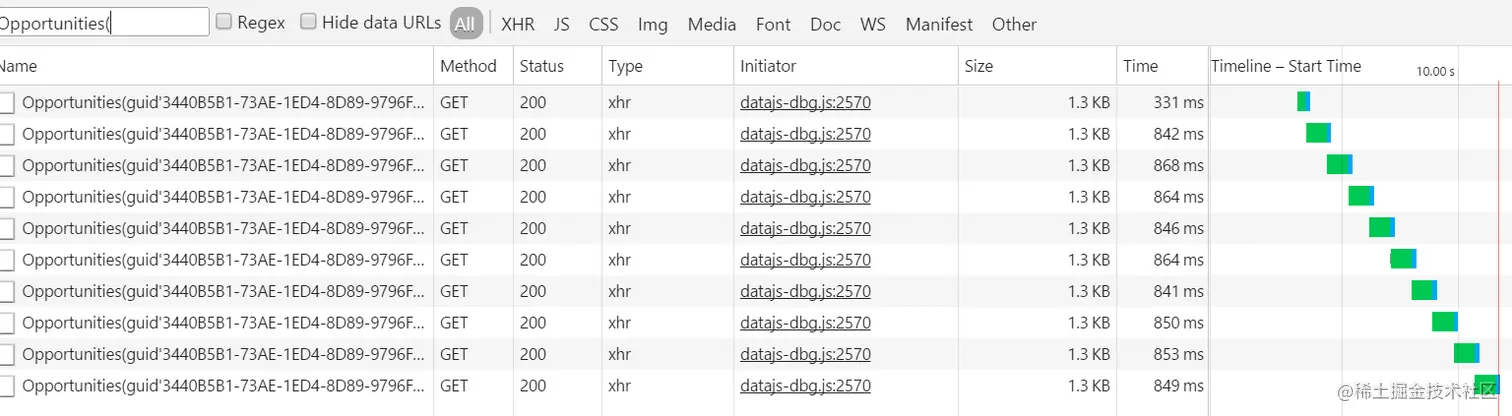10个同步请求的执行情况如下图所示:同Timeline序列栏可以看到,10个同步请求按时间顺序,被后台处理,再依次收到响应。