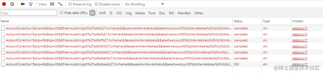 当时组内有同事观察到一个现象:如果用户快速输入一连串字符,则在Chrome开发者工具Network标签页里,从时间顺序上来说,先触发的OData请求,状态会被标注为canceled:
