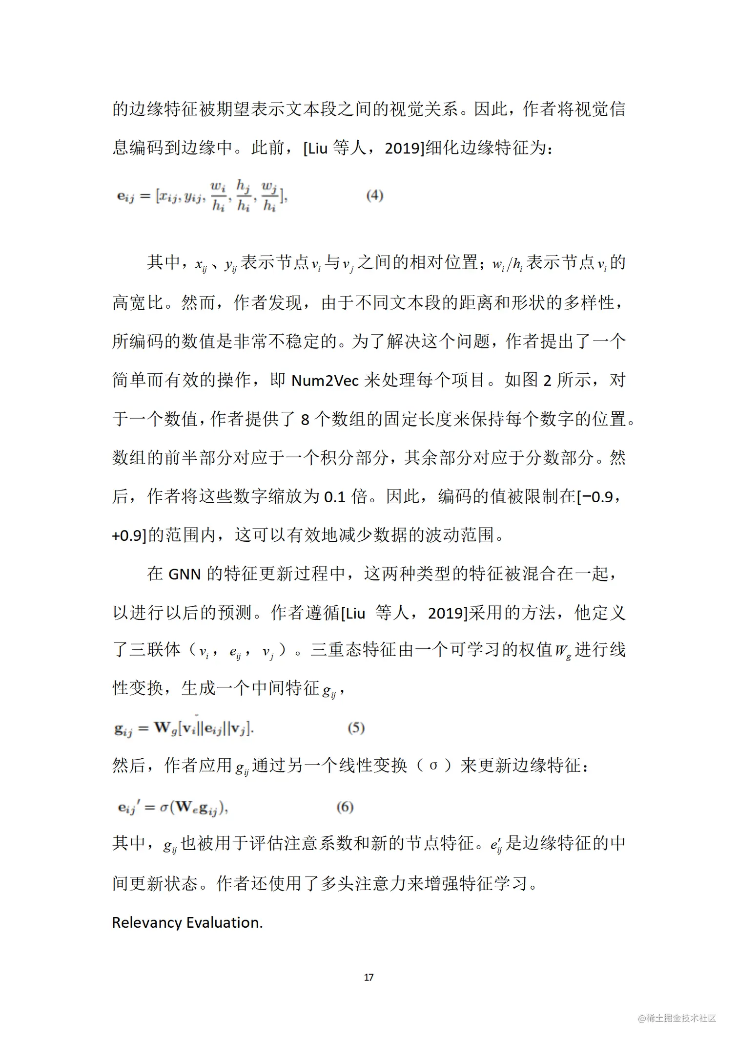 因此,以语义特征作为节点特征,以文本片段的空间位置特征作为边缘特征,构建全局文档图通常是一种更好的解决方案。另外几种方法[Qian等人,Liu等人,Yu等人,Gal等人,Cheng等人]使用GNN对文档的布局信息进行建模。通过节点之间传递的消息,这些模型可以学习每个文本的总体布局和分布,这有助于后续的实体提取。例如,Gui等人提出了一种基于词汇的图神经网络,将中文NER(命名实体识别)视为节点分类任务。此外,GraphIE [Qian等人]和Liu等人提出的模型通过GNN提取视觉特征,增强BiLSTM-CRF模型的输入,被证明是有效的。与全连接或手工制作的图不同,PICK [Yu等人]通过图学习预测了节点之间的连接,这也提高了结果。这些方法使用GNN编码文本嵌入,给定视觉上丰富的上下文,以隐式地学习键-值关系。