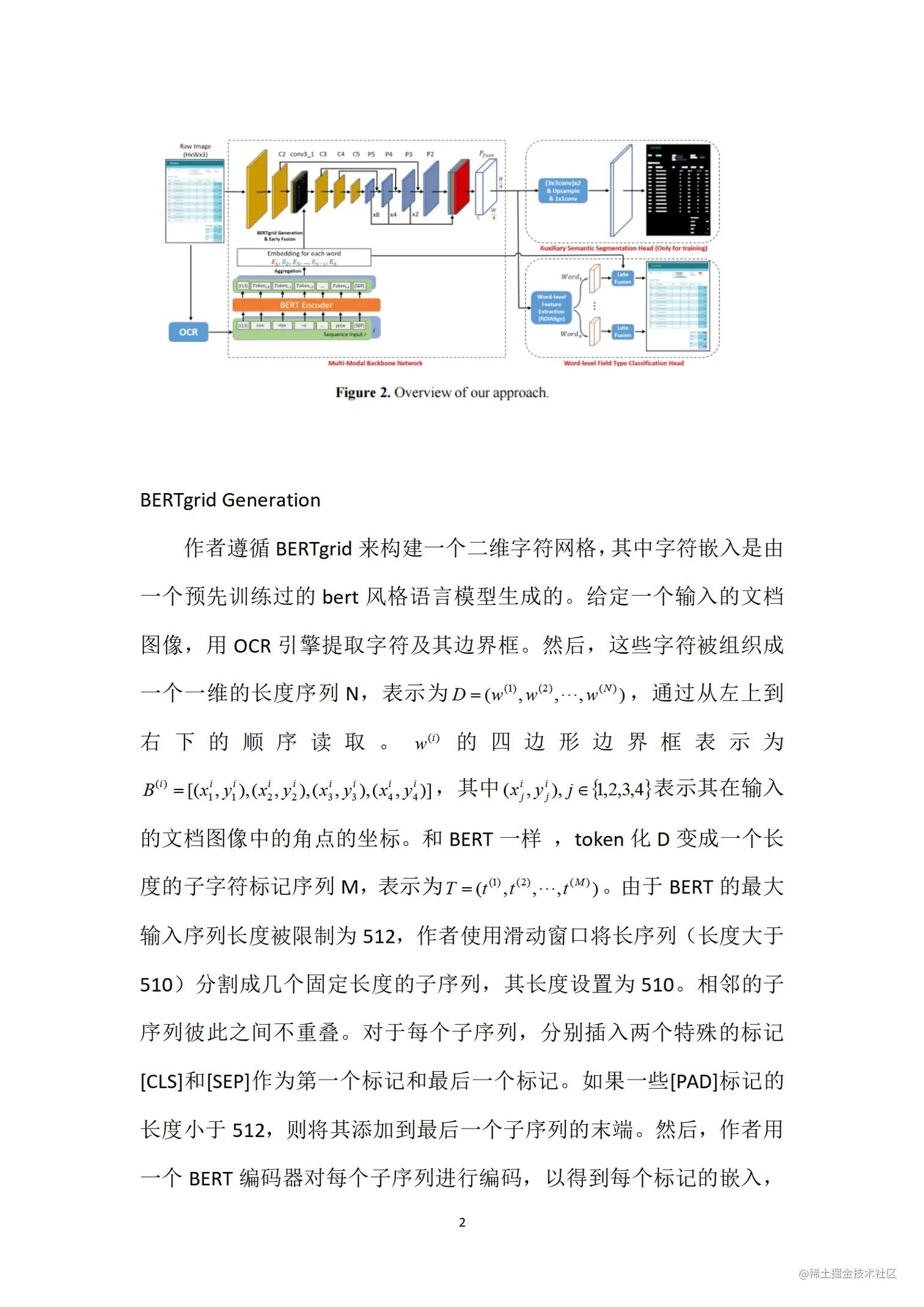 研究人员从不同的角度探讨了信息抽取任务。Hwang等人和Jiang等人基于坐标信息序列化文本片段,并将坐标输入到序列标记器。然而,简单地将该位置视为某种特征,可能不能充分利用文本之间的视觉关系。为了充分利用语义特征和位置信息,Chargrid [Katti等人]将字符映射到一个热向量上,从而填充文档图像上的字符区域。将带有语义信息的图像输入CNN进行检测,并进行语义分割,提取实体。后来的BERTgrid [Denk和Reisswig等人]采用了类似的方法,但使用了不同的字符嵌入方法。然而,它通过使用通道特性来表示语义,引入了大量的计算,特别是具有大类别的语言。