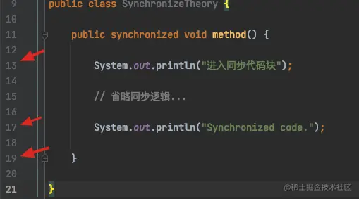 在源代码第13行时进入到同步代码块中,在第19行时退出同步代码块。结合monitorenter和monitorexit指令的执行时机体现在程序里就是: