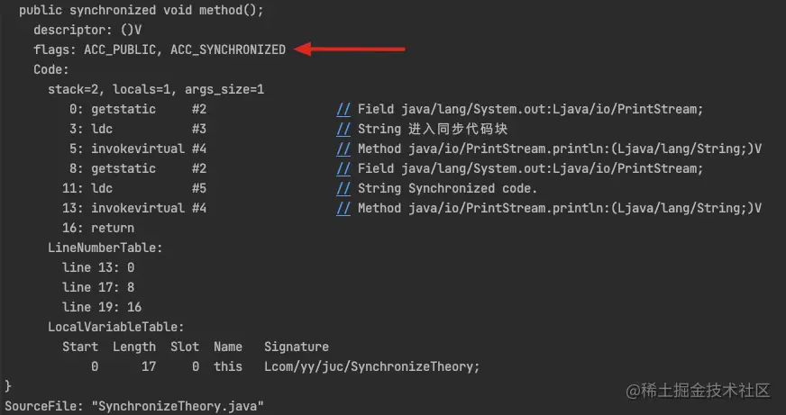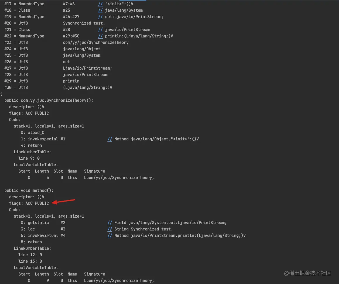 可以看到,标志位在原有ACC_PUBLIC的基础上,又新增了ACC_SYNCHRONIZED标识符。说明method还是一个同步方法。