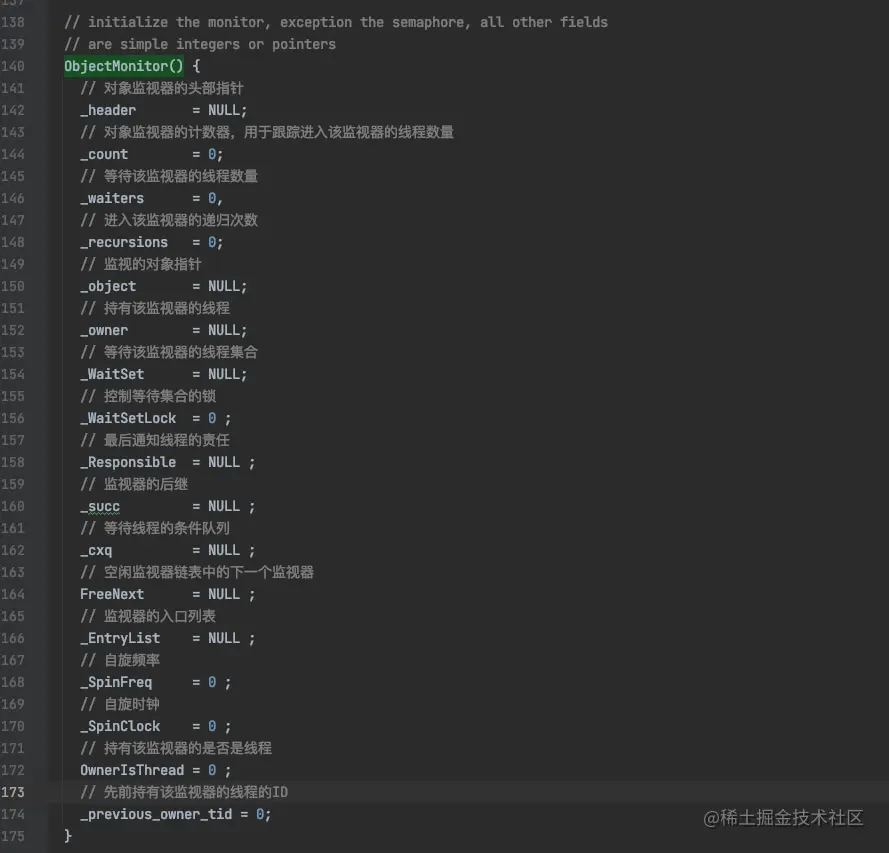 在Java虚拟机中,每个对象都会与一个Monitor关联。它通常被描述为一个对象。与一切皆对象一样,所有的Java对象都有成为Monitor的潜质。因为在Java的设计中 ,每一个Java对象设计中就带了一把看不见的锁,它叫做内部锁或者Monitor锁。也就是通常说Synchronized的对象锁,MarkWord锁标识位为10,其中指针指向的是Monitor对象的起始地址。在HotSpot实现的Java虚拟机中,Monitor是由ObjectMonitor实现的: