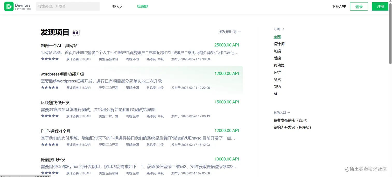 这个平台更多是针对远程兼职,项目多样,内容丰富,但很多远程兼职是需要长期去做的,适合那些想体验wfh的程序员,也有不少相对比较初阶的项目可供选择。