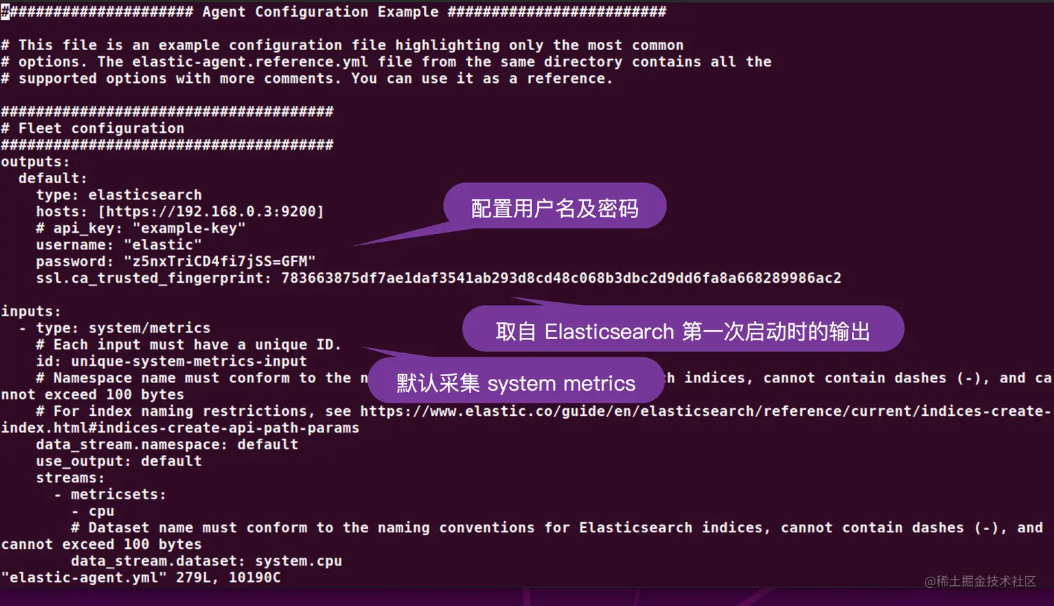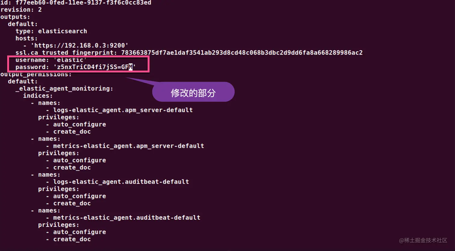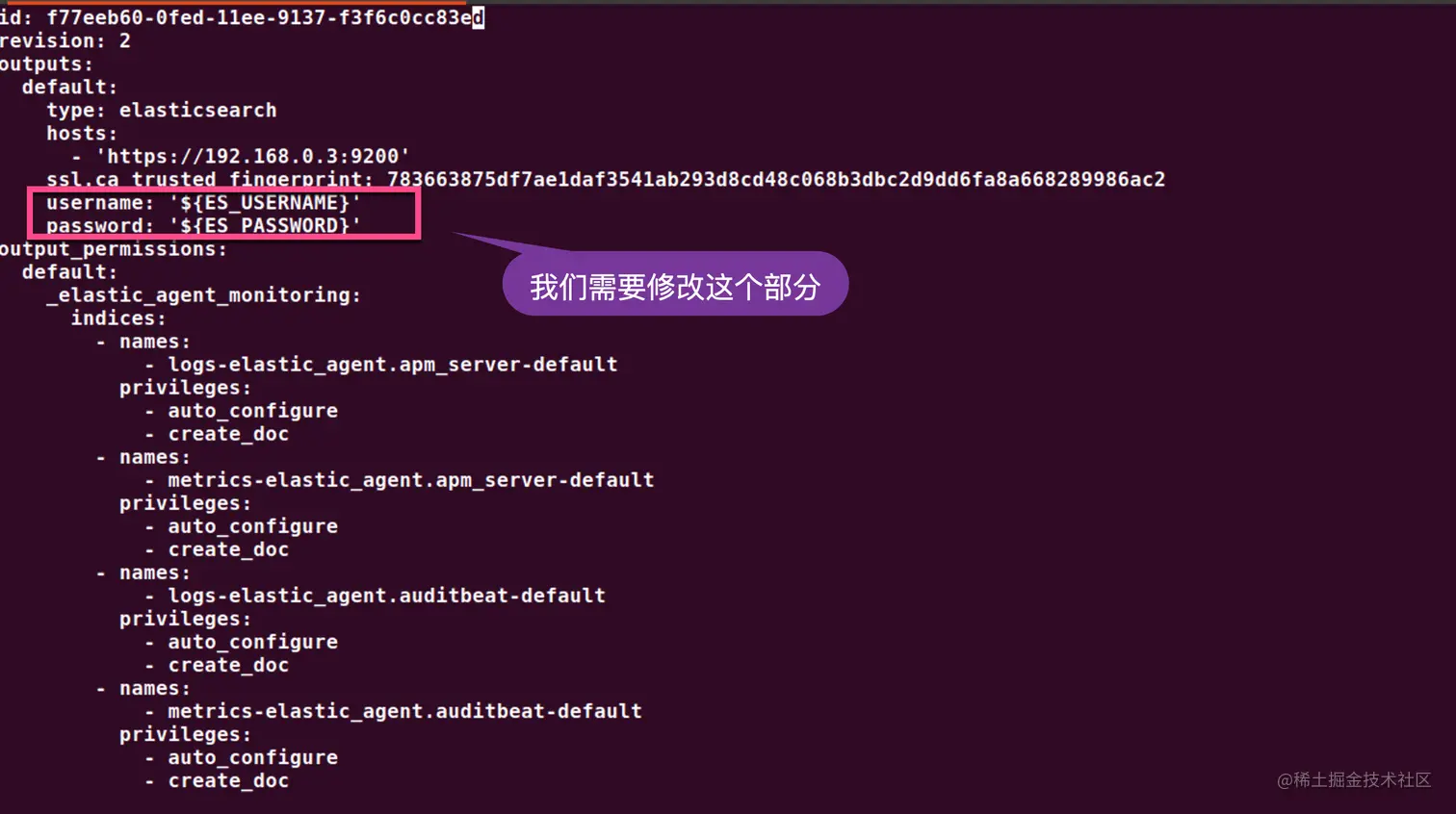 关于这里的 user,password 及 ca_trusted_fingerprint,请参考上面的 elastic-agent.yml 的配置。