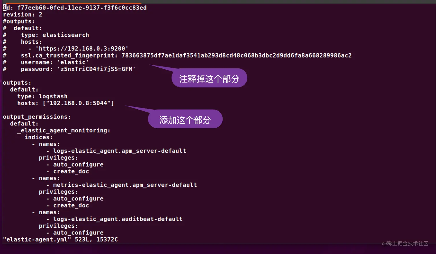 在上面,我们卸载了之前安装的 Elastic Agent。我们接下来重新配置 elastic-agent.yml 文件: