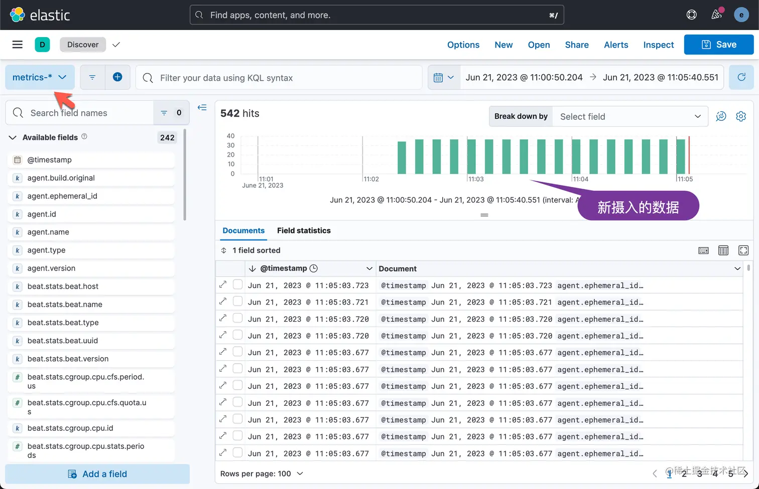 在 Discover 里我们可以看到刚被摄入的 metrics 数据。请注意在目前为止,我们只摄入默认的 system metrics 数据。