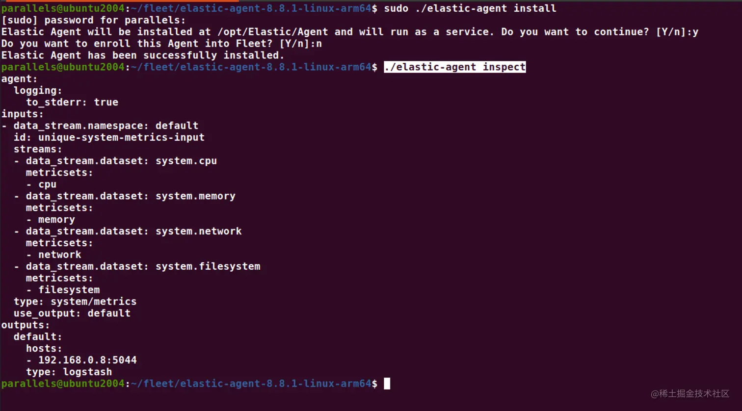 1. parallels@ubuntu2004:~/fleet/elastic-agent-8.8.1-linux-arm64$ sudo ./elastic-agent install