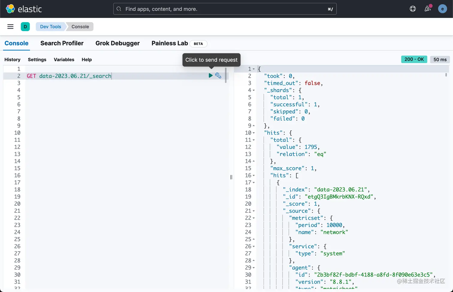 我们可以看到新生成的 data-2023.06.21 索引文件。这样我们就把数据通过 Logstash 把数据写入到 Logstash 里了,进而写入到 Elasticsearch 中去了。