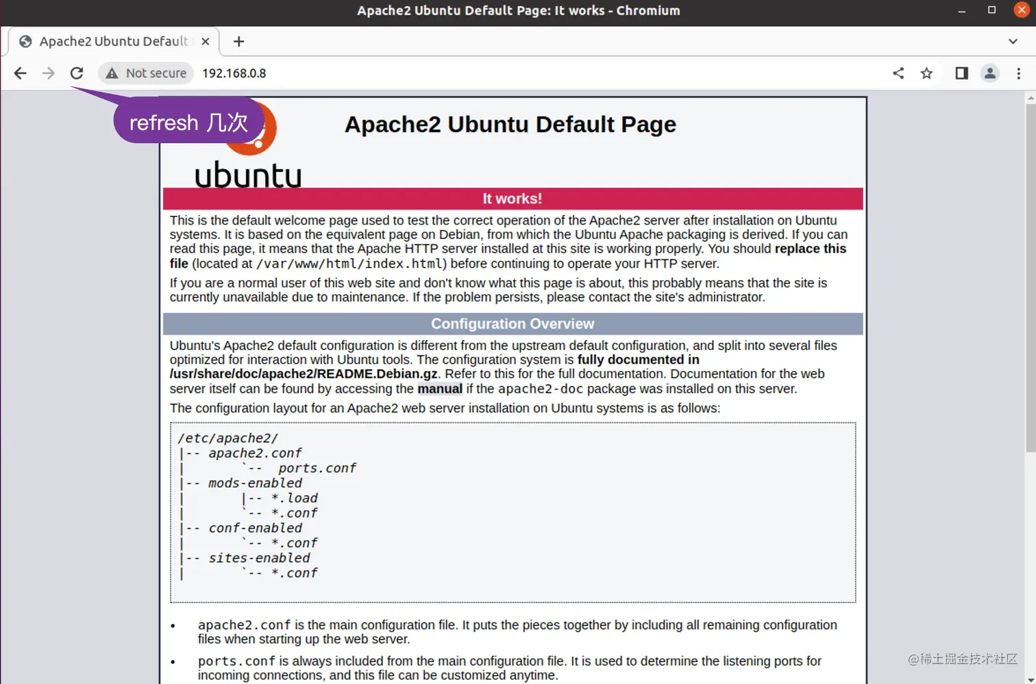 我们在 Apache 的页面上点击 refresh 按钮几次: