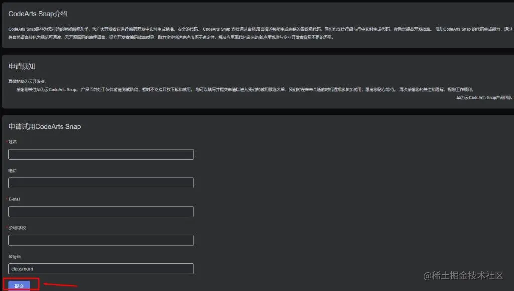 点击提交后,华为云CodeArts Snap产品团队将会在一天内通过您的试用申请