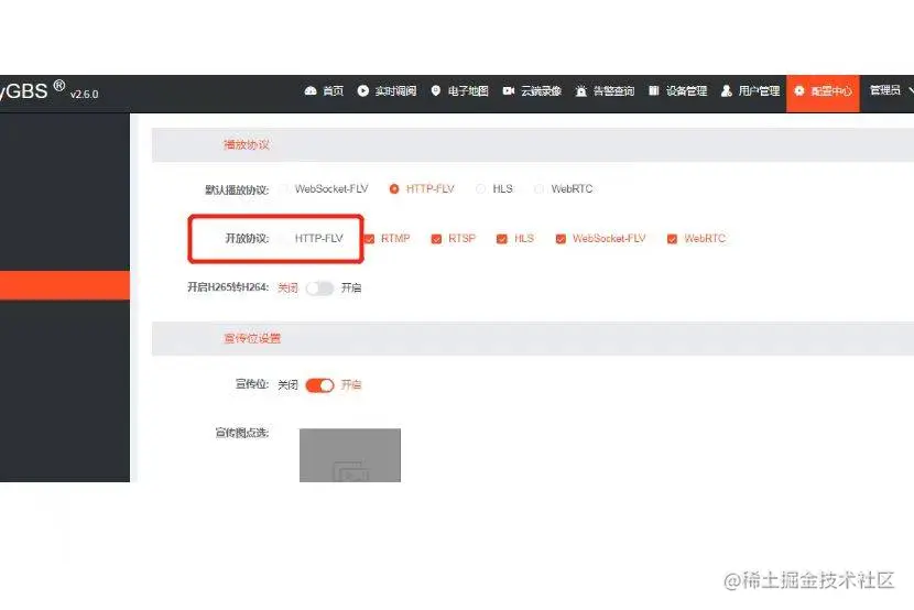 3)查看web页面配置,发现用户选择了默认使用HTTP-FLV协议播放,但并没有开启HTTP-FLV协议;