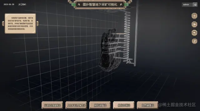 图扑软件 HT 采矿数据可视化版块结合虚拟现实技术,将矿体开采过程模拟成三维场景,让采矿工人可以直观地了解矿体的变化,更好地控制采矿过程。同时,数字孪生还可以结合人工智能技术,对采矿过程进行智能化管理和优化,提高采矿效率和安全性。