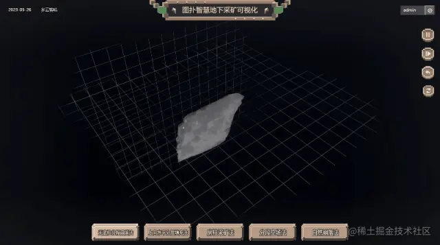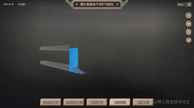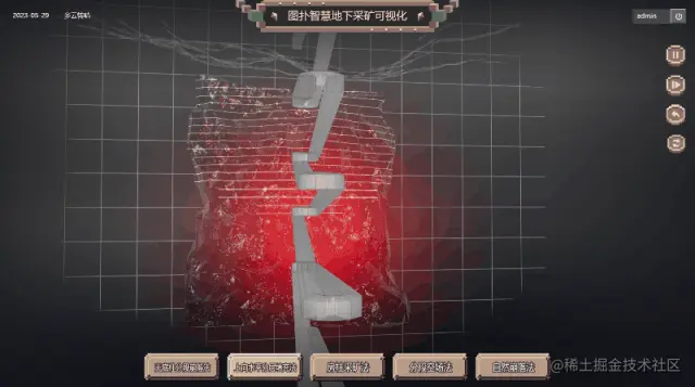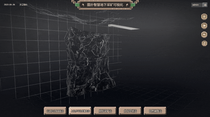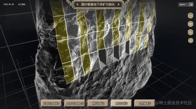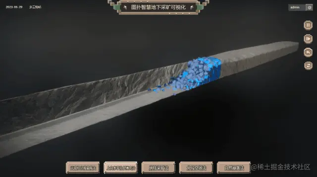 基于 Web 3D 开发技术搭建的无底柱分段崩落法过程还原,将采矿过程中的各环节、使用技术及设备、传感器及数据信息进行原比例 3D 建模渲染还原,实时加载采矿产能运维数据,模拟现实世界采矿的设备运行状态。