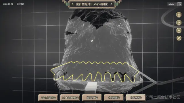 HT 采用最新研发的物理碰撞技术结合三维模型数字孪生可视化在地下采矿中实现了,可视化数字孪生模拟无底柱分段崩落法的矿体开采过程。通过 HT 引擎渲染,我们可以实时监测矿体的变化,包括矿体的形态、大小、位置等信息,并根据这些信息进行实时调整和优化采矿方案。