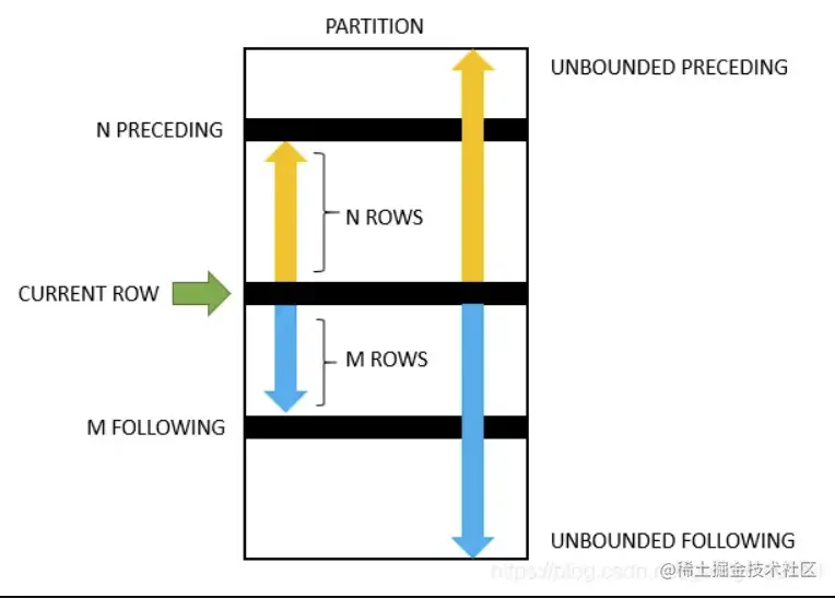 CURRENT ROW: 表示当前行。UNBOUNDED PRECEDING: 表示分区中的第一行。UNBOUNDED FOLLOWING: 表示分区中的最后一行。expr PRECEDING: 表示当前行减去expr的值。expr FOLLOWING: 表示当前行加上expr的值。