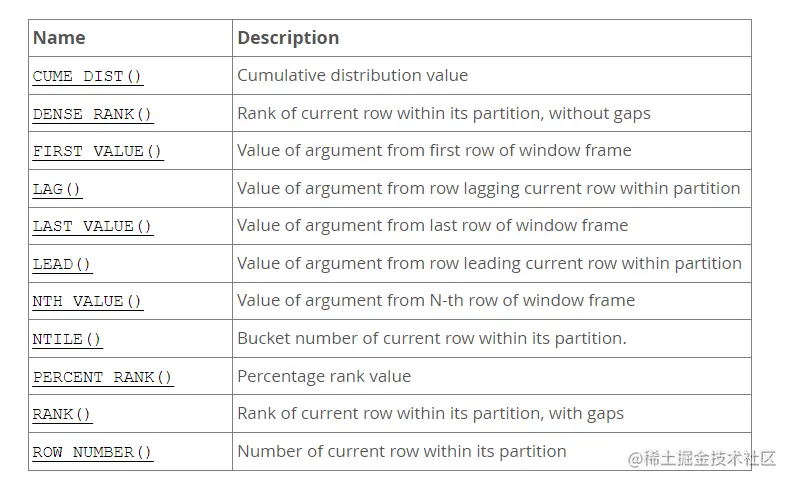 window_function_name 函数可以是聚合函数或者非聚合函数。MySQL8 支持以下几类窗口函数,