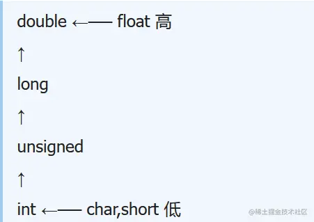 如果一个运算符两边的运算数类型不同,先要将其转换为相同的类型,即较低类型转换为较高类型,然后再参加运算,转换规则如下图所示。