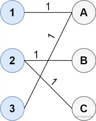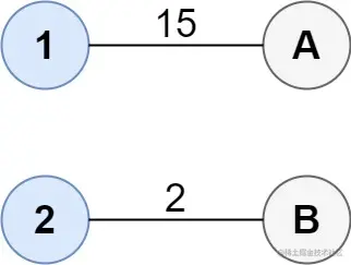 请注意,虽然有多个点连接到第一组中的点 2 和第二组中的点 A ,但由于题目并不限制连接点的数目,所以只需要关心最低总成本。