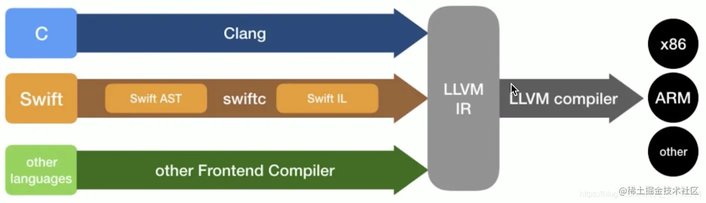 交给统一的编译器后端LLVM 编译成各个架构的可执行程序, 如ARM x86等