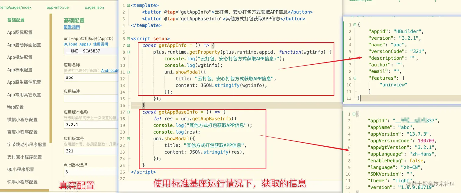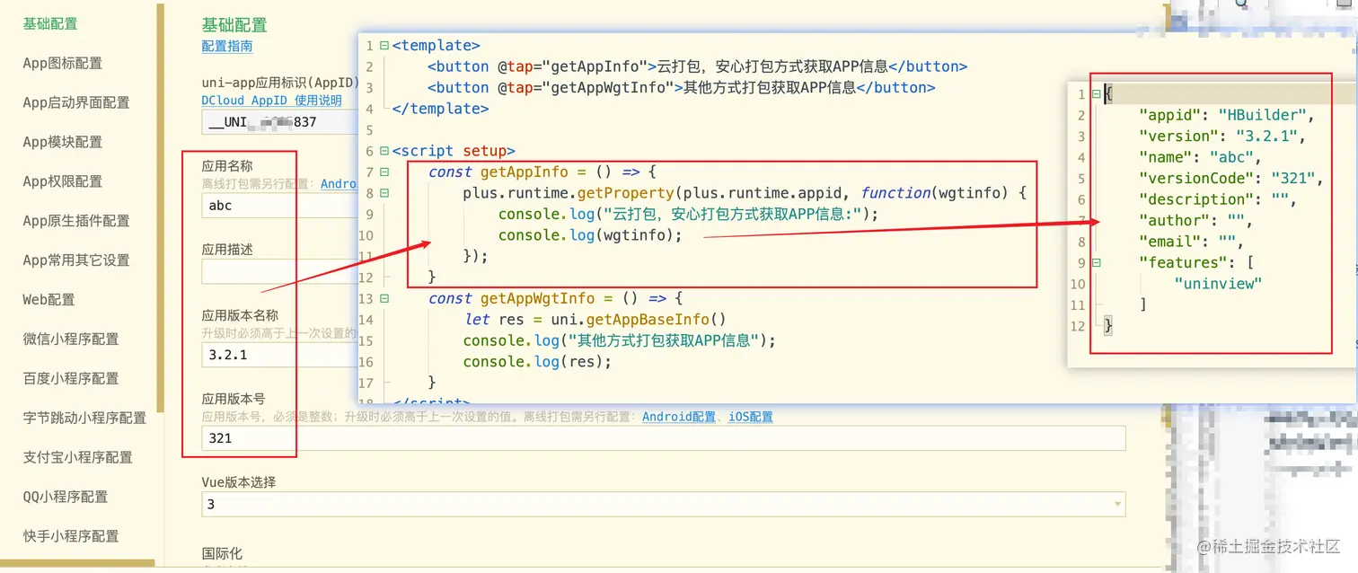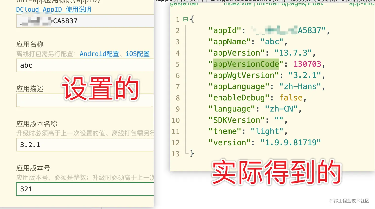 - 我们使用uniapp的官方文档中uni.getAppBaseInfo()后获取的 appVersionCode appVersion ,发现获得的结果和我们实际设置的不一致,不是manifest.json里面的值,如下图所示