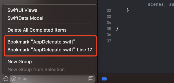 先切换到这个 tab,然后点击左下角三个点菜单按钮,会出现一个菜单,可以选择 Bookmark "SomeFile.swift" 来把这个文件添加为书签,或者选择 Bookmark "SomeFile.swift" Line XX 来把光标所在的这一行添加为书签。