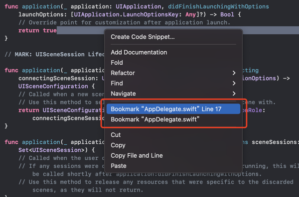 光标选中某一行,点击鼠标右键,在弹出菜单中操作,可以选择 Bookmark "SomeFile.swift" 来把这个文件添加为书签,或者选择 Bookmark "SomeFile.swift" Line XX 来把光标所在的这一行添加为书签。