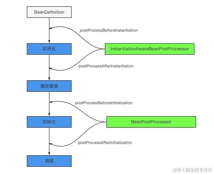 我们知道在Spring中,Bean的初始化一般分为实例化,属性赋值,初始化和销毁这四个过程。在实例化阶段的前后,InstantiationAwareBeanPostProcessor接口的postProcessBeforeInstantiation和postProcessAfterInstantiation方法会被调用。在初始化阶段的前后,BeanPostProcessor接口的postProcessBeforeInitialization和postProcessAfterInitialization方法会被调用。开发者也可以继承这些接口拓展功能。如下图所示: