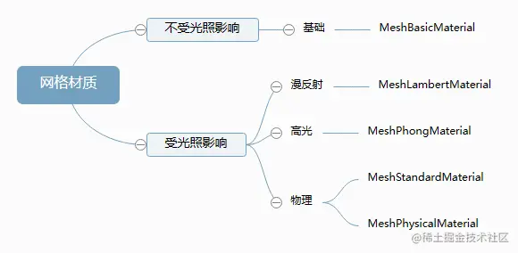 MeshLambertMaterial对应的Mesh受到光线照射,没有镜面反射的效果,只是一个漫反射,也就是光线向四周反射。