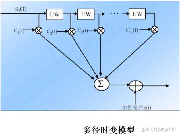 W信道传输信号带宽, 1 / W 为时间分辨率, 抽头 为互不相关的高斯随机过程。延迟线长度与多径信道中的时间弥散量相对应。多径扩展可以表示为 , 其中 为多径信号分量的最大数目。
