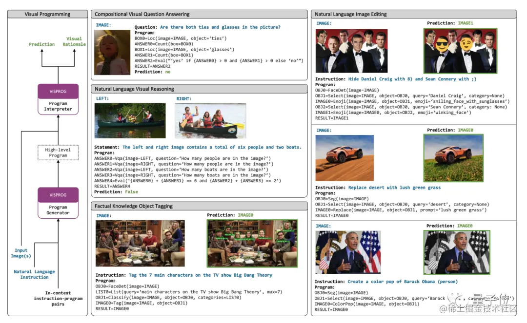 在第二篇论文中,研究人员提出了VISPROG,是一种神经符号结合(Neuro-Symbolic)的方法,用于在给定自然语言指令的情况下解决复杂和组合的视觉任务。