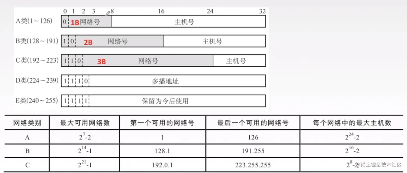 根据不同的取值范围,早期将IP地址分为五类。IP地址中前5位用于标识IP地址的类别,A类地址的第一位为“0”(主机号24位),B类地址的前两位为“10”(主机号16位),C类地址的前三位为“110”(主机号8位),D类地址的前四位为“1110”,E类地址的前五位为“11110”。其中,A类、B类与C类地址为基本的IP地址。