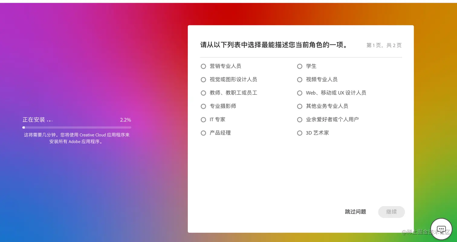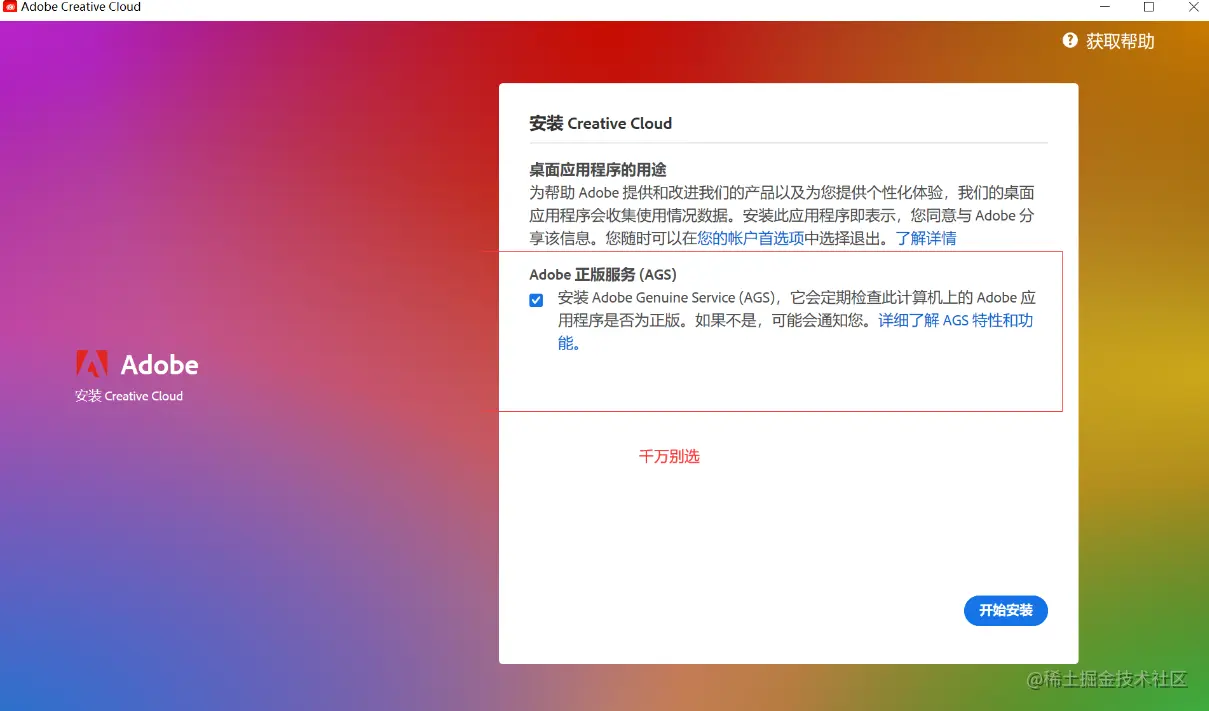 然后安装界面开始进入到这一步,这一步记得这里 Adobe正版服务 别勾选