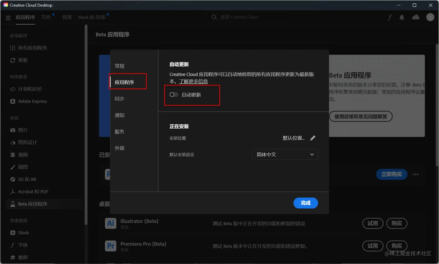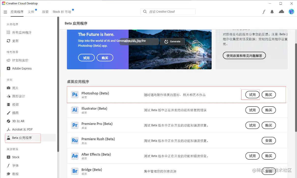 点击左侧beta应用程序,再点击右侧photoshop(beta)试用。这时候就会开始自动安装。(没有这ps beta的话就是前面步骤出错了,位置没有选美国)