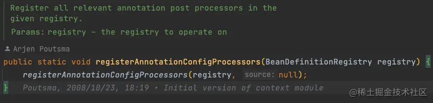 - reader.register(componentClasses) AnnotatedBeanDefinitionReader.register()讲当前配置类注入到容器中( DefaultListableBeanFactory#Map<String, BeanDefinition> beanDefinitionMap)