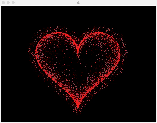 def heart_function(t, shrink_ratio: float = IMAGE_ENLARGE): x = 16 * (sin(t) ** 3) y = -(13 * cos(t) - 5 * cos(2 * t) - 2 * cos(3 * t) - cos(4 * t)) x *= shrink_ratio y *= shrink_ratio x += CANVAS_CENTER_X y += CANVAS_CENTER_Y return int(x), int(y)