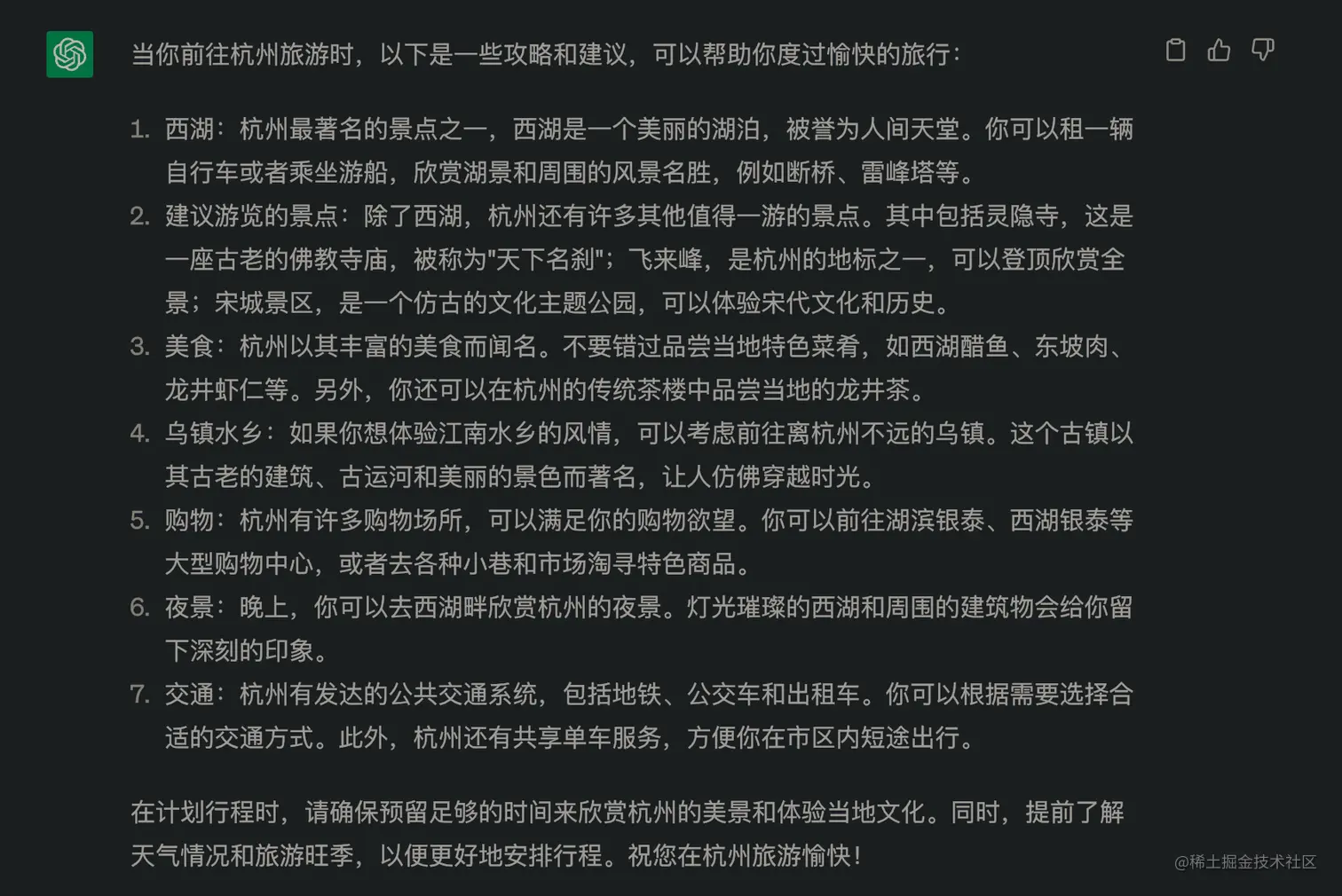 举个例子,比如我给ChatGPT的问题是“我想去杭州旅游,给我个攻略”,得到的回答是这样的: